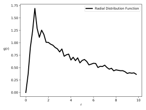 The rdf of a solid has very sharp peaks corresponding to the separation between lattice sites that particles are stuck to. The rdf of a liquid usually has a series of peaks separated by the particle diameter corresponding to the solvation shells, and a gas shows a small peak at small separations that quickly decays to 1. The radial distribution function can be used to calculate many physical properties of a system like the pressure and total potential energy, and it is related to the potential of mean force, or the work required to bring two particles to a certain separation from infinity: